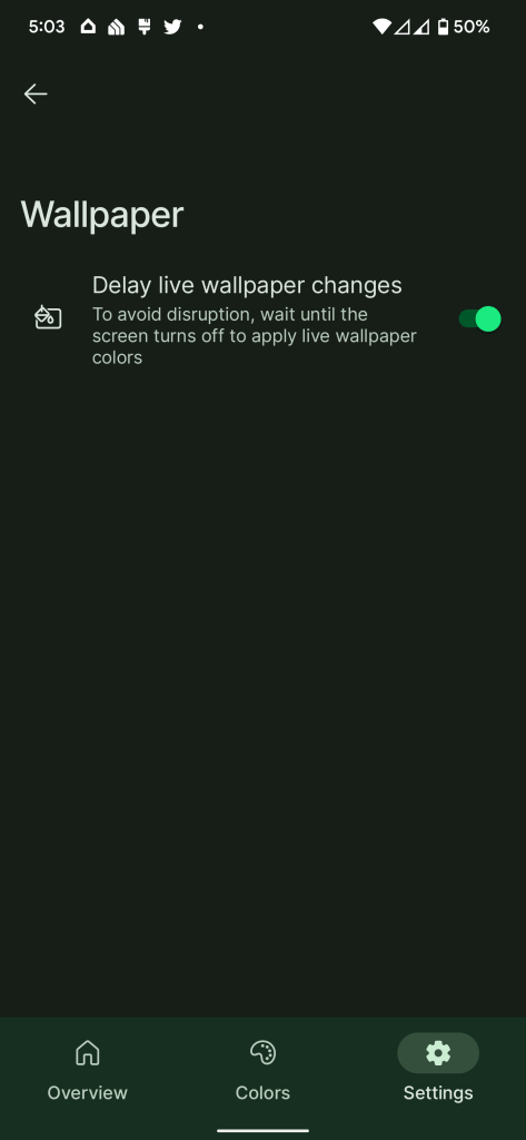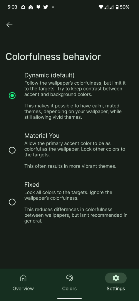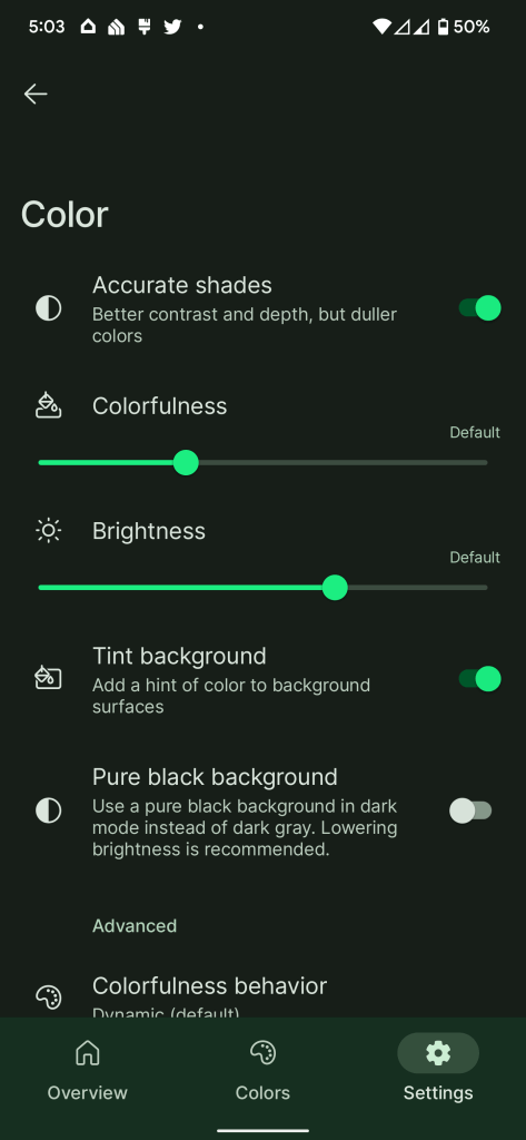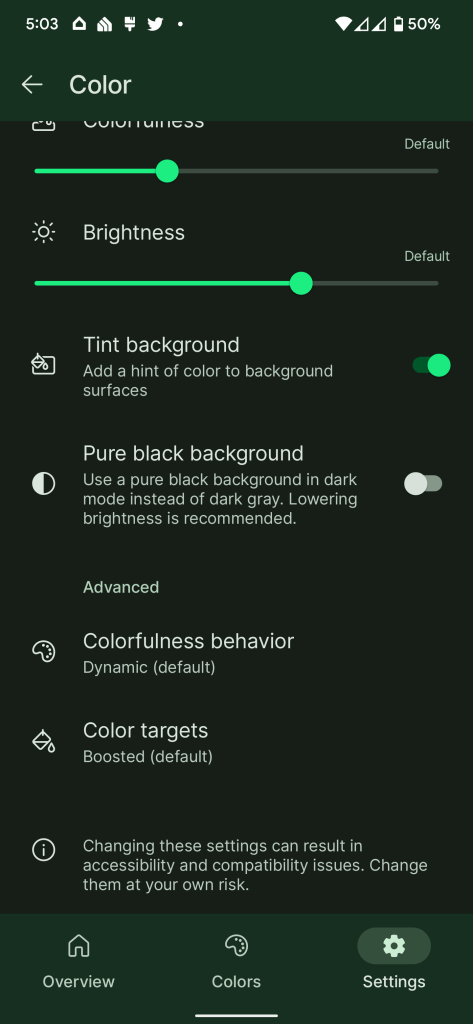 As useful as that is already, the thing that really got me excited about Repainter was its ability to tweak the intensity of Android 12’s colors. You can force colors to be more vivid, swap gray backgrounds for pure black, which looks fantastic on OLED displays, and toggle the color tints on background surfaces. You can even tweak color changes so that live wallpapers won’t change the color theme while you’re actively using the device, something that can cause apps to close/crash unexpectedly.