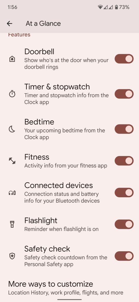 The improved settings menu redesigns the At a Glance options to fit in with the rest of the Android 12 aesthetic with Dynamic Color and Material You tweaks. It also brings more toggles for other plugin options such as Flashlight, Connected Devices, and Safety Check reminders within the At a Glance widget — alongside the Doorbell previews. Rahman noted in a follow-up tweet that he was unable to get these added options working on his devices having manually enabled the updated look on his devices.