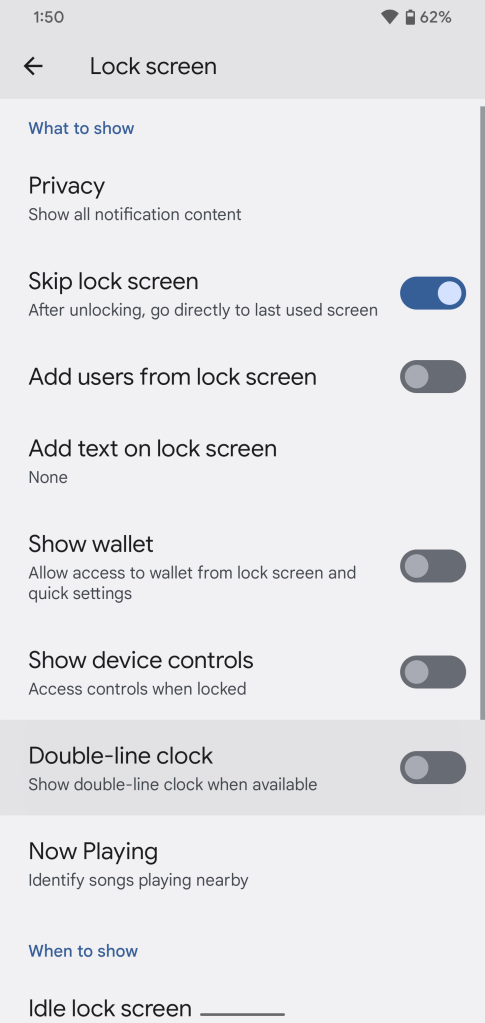 In Android 12L Beta 2, Google adds an option to turn off the fullscreen two-line lockscreen clock. It lives under Settings > Display > Lock Screen > “Double-line clock.” By default, this option is turned on, enabling the two-line clock to appear in the absence of notifications. With the option disabled, though, Android 12L will never show the two-line design for the lockscreen clock.