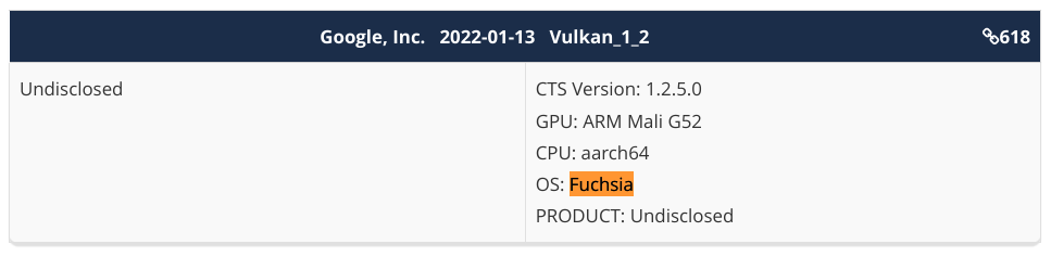Update 1/13/22: A new Google product has appeared in the list of Vulkan conformant devices and software. Vulkan, for reference, is a cross-platform 3D graphics API used in Fuchsia, among many other places. What’s important here is the listing itself, which lists “Fuchsia” as the operating system, confirming our suspicions that Google is preparing to update another device to Fuchsia or launch a new one with the OS.