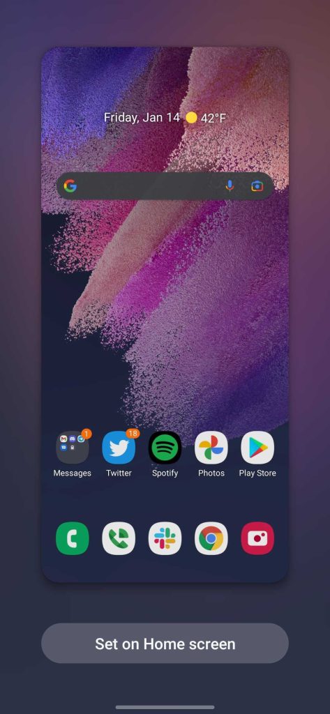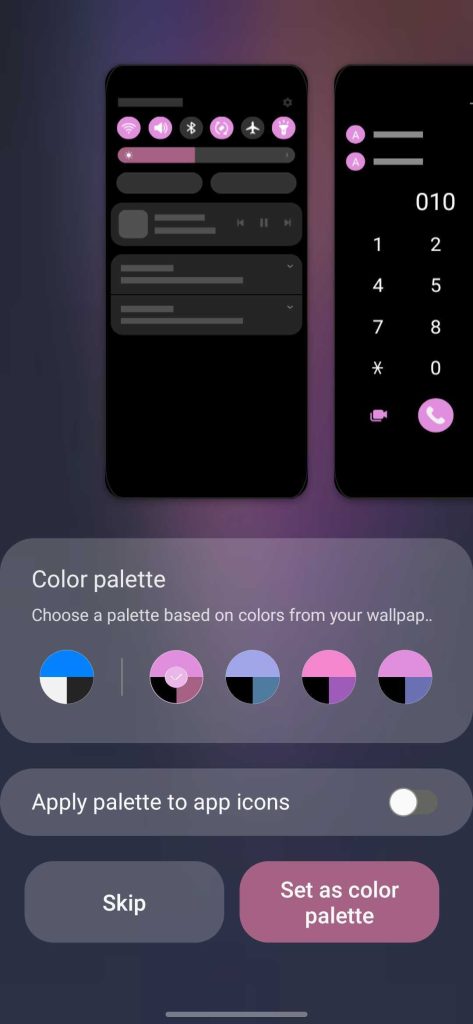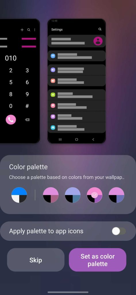 There’s also a bonus to the Galaxy S21 FE when it comes to software – this phone ships with Android 12 out of the box and Samsung’s One UI 4.0 skin. While Android 12 isn’t a major upgrade on Samsung phones, this means you get all of Android’s best new features out of the box. That includes new privacy indicators for when the camera or microphone are in use, revamped homescreen widgets, and also system colors that sync with your wallpaper. As pictured below, Android 12 will automatically pick out colors from your wallpaper and apply those to the system’s various accents and buttons.