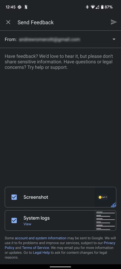 - Here, you can choose which Google Account to send from and type out your feedback.