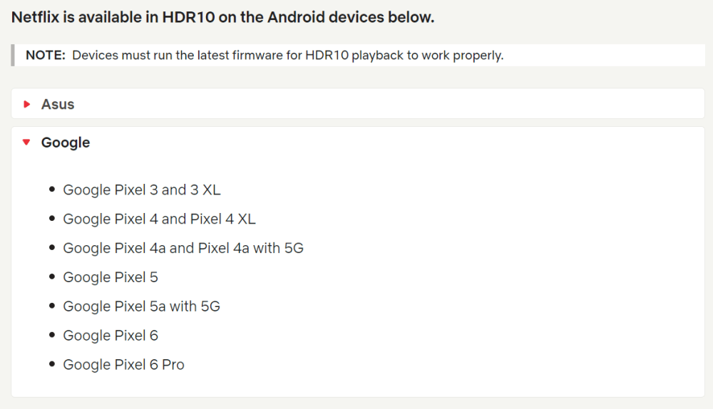 Netflix often certifies devices shortly after launch, but it has taken a little while for the dedicated support pages to add the latest and greatest from Google. The Netflix app for Android already lists the Pixel 5a with 5G, Pixel 6, and Pixel 6 Pro as HDR capable, but it’s not clear if this notable site change means that existing problems have been, or are set to be, resolved.