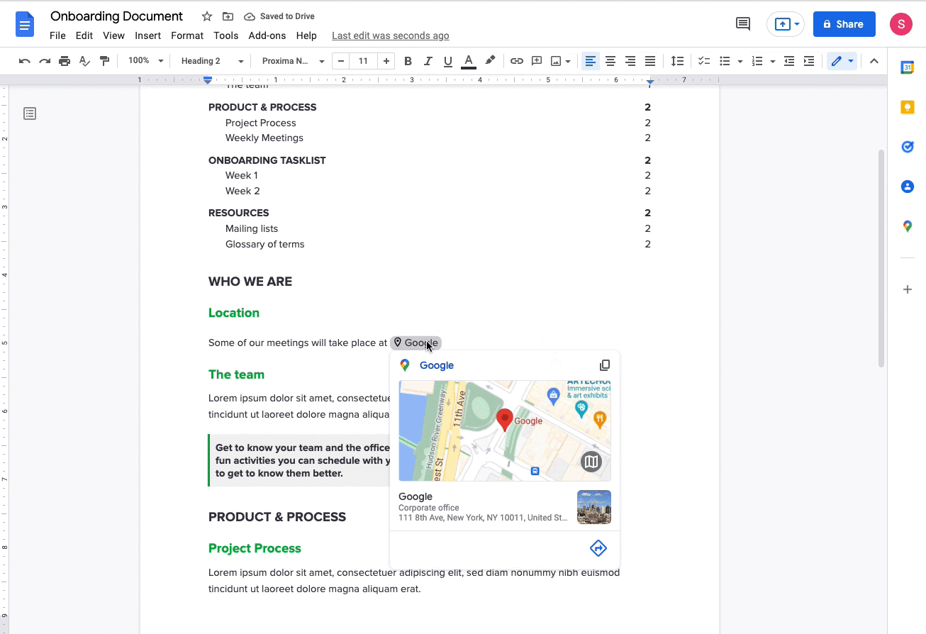 When you click on the smart chip, you’ll see a thumbnail with helpful information—like an image of the location in Maps and the address—or click the thumbnail to open a preview in the Docs side panel.