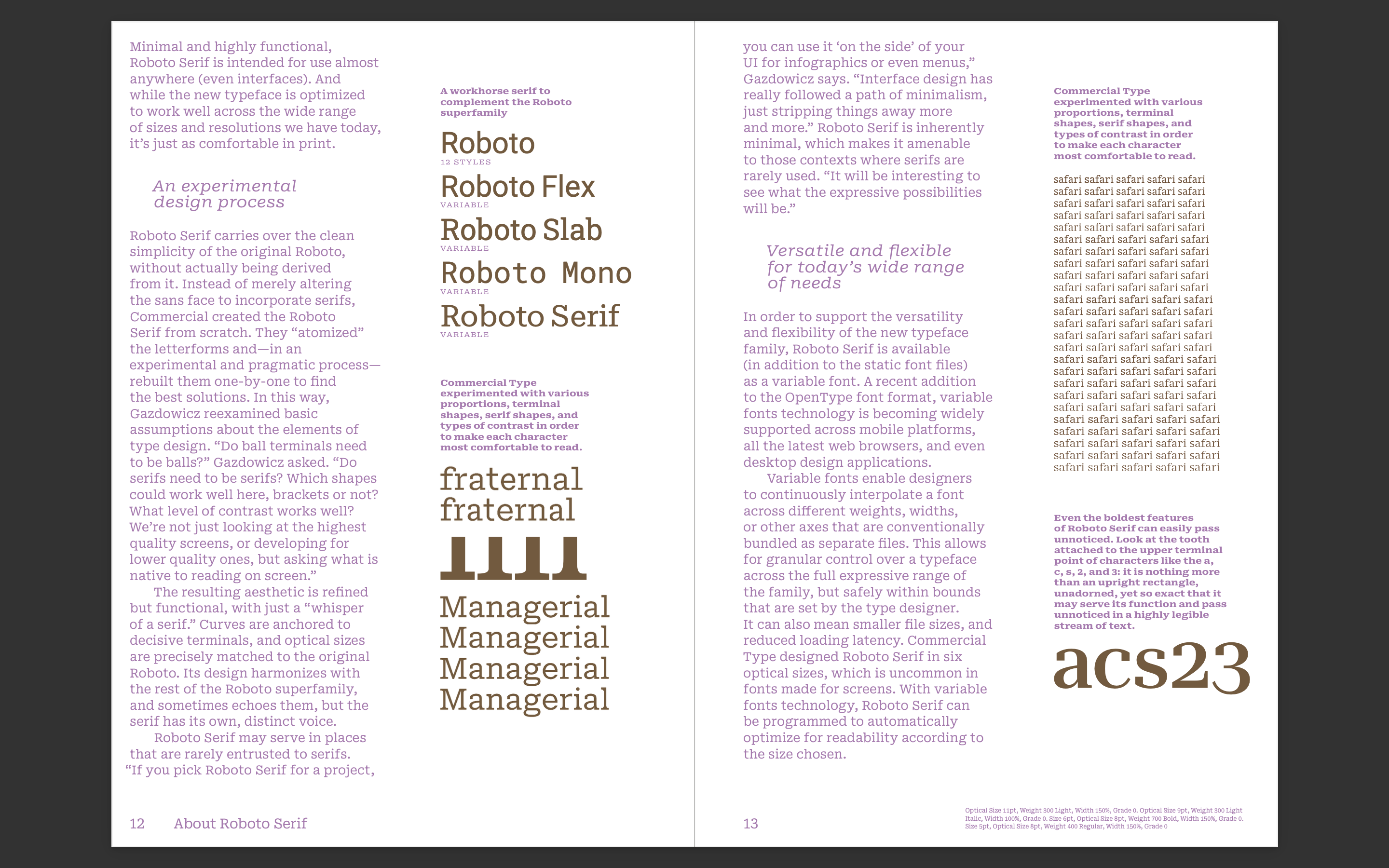 The Google Fonts website credits Commercial Type (Principal design) and Greg Gazdowicz as Roboto Serif’s designers, but Google did commission its creation. Available to download today, the font is licensed under the Open Font License. An accompanying type specimen is offered here.