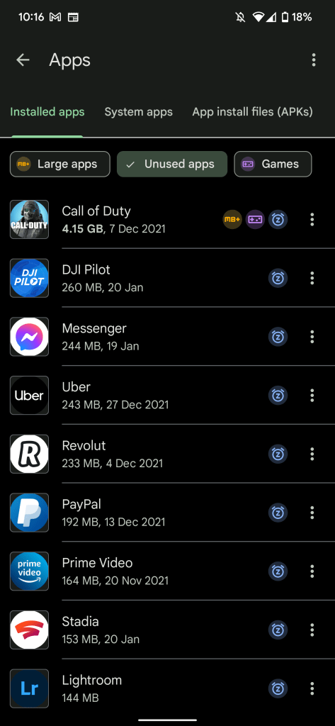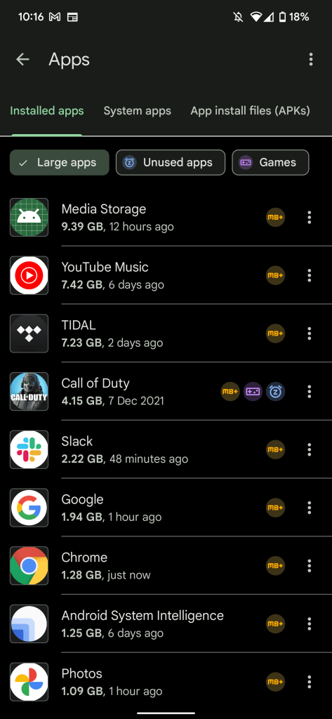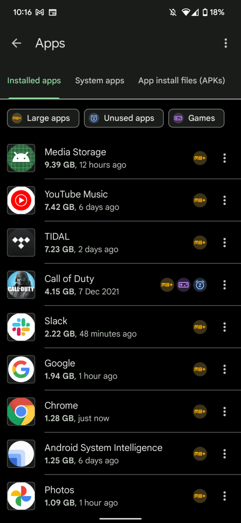 It’s also worth noting that you can activate each chip simultaneously too, which will unveil or reveal the largest games or apps you haven’t used in a while. You’ll likely notice are some small colorful icons to denote just what category each app on your device falls within too: