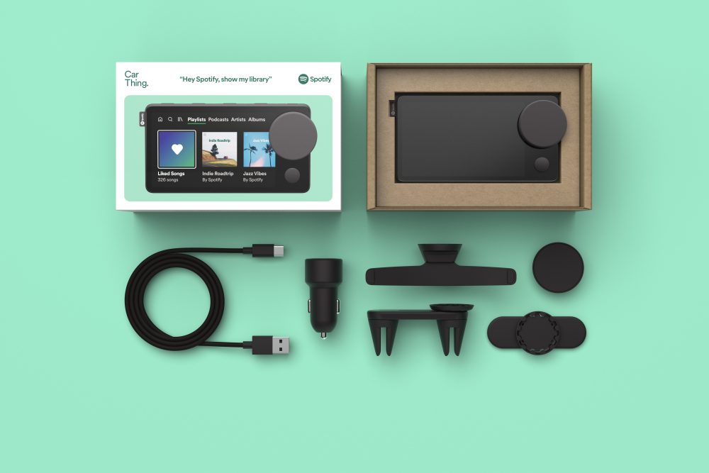 For its $90 price tag, Car Thing ships with a power cable, power adapter, the device itself, and a variety of mounts.