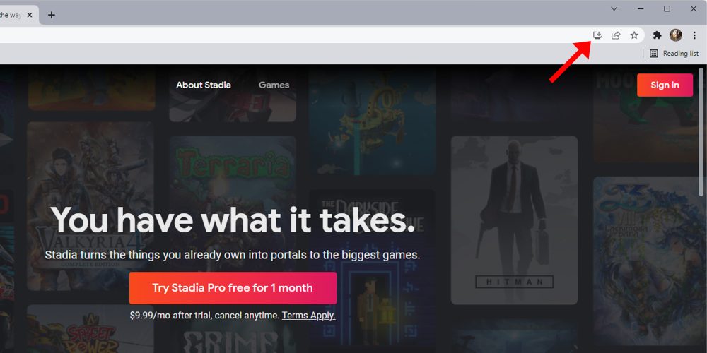 Lastly, the install PWA extension icon is one that appears in certain circumstances. It appears when a website wants you to download a companion web app. For instance, if you head to Stadia on Chrome, you’ll find that Google wants you to install Stadia on your device as a separate program.