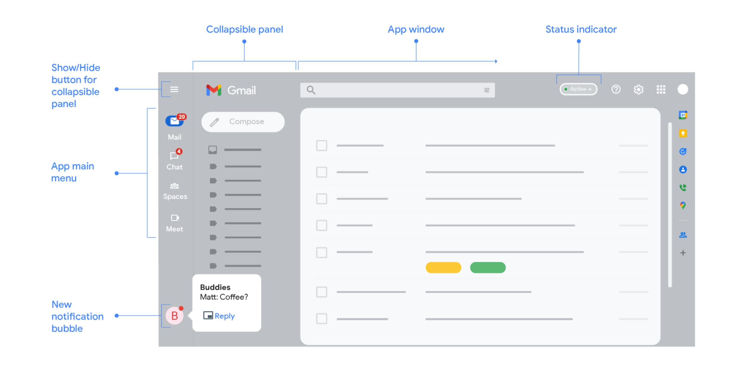 The “app main menu” at the very left of your screen is the equivalent of Gmail for Android’s bottom bar. This navigation rail — in Material Design parlance — goes hand in hand with Google’s vision for an integrated/unified Gmail that includes Chat, Spaces, and Meet. It’s supposed to let you work with just one tab open.