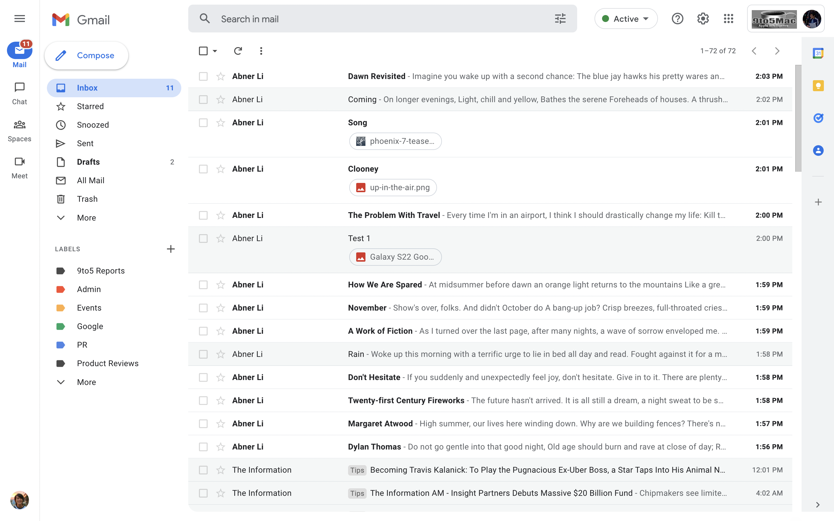 That said, one nice touch is how minimized chat windows that were previously docked to the bottom-right of the screen now appear in the navigation rail as circular avatars. It’s cleaner and doesn’t clutter up the bottom of your screen when composing emails. You can have up to six 1:1s, group chats, and even spaces appear there. This design detail is actually quite revealing. It’s a smart place to put what are effectively chat heads that reflects how the old Gmail badly needed a visual reorganization.