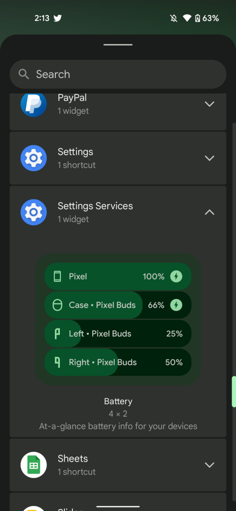 As our Dylan Roussel pointed out, the new battery widget requires Android API level 32+, which means you need Android “12.1,” better known as 12L. We were able to successfully get the new battery widget up and running on a Pixel 6 running the Android 12L beta, and a 6 Pro running Android 13. You’ll just need to check for an update to “Settings Services” in the Play Store.