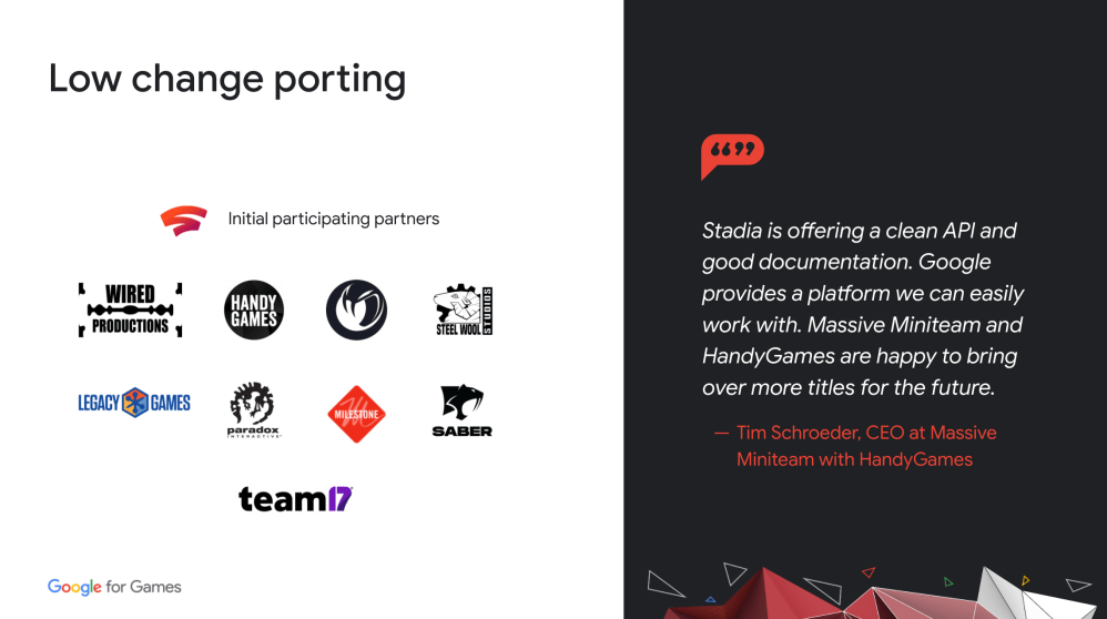 From this keynote and the Low Change Porting efforts, it’s clear that Google has ambitions to continue enticing studios to bring games to its streaming platform, both for the sake of Stadia and for the now formally unveiled “Immersive Stream for Games” white label service.
