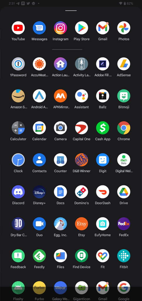 Switching our Pixel 4 XL test device to a tablet-like DPI, we can take a look at what Google has changed in Android 13 for bigger screens. In the first developer preview, we noticed that the Pixel Launcher had been updated to respect two different layouts, one for big screens and another for smaller, hinting strongly at a folding Pixel phone. Now, Google has also updated the taskbar in Android 13 to support an app drawer.