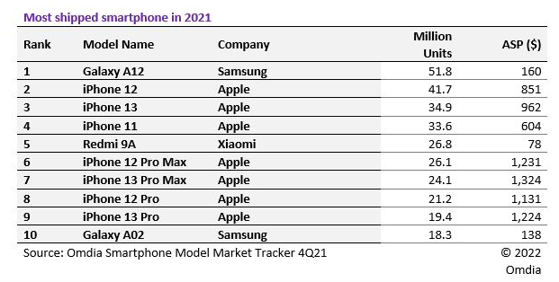In 2021, the most popular smartphone was apparently Samsung’s Galaxy A12, according to Omdia. That’s a device that retails for around $180 in the United States, and one of the most affordable devices in Samsung’s entire lineup. There were two other budget Android phones that made it into the top ten, with the Galaxy A02 and its roughly $140 price taking the number 10 spot, and the Xiaomi Redmi 9A with its $80~ price taking fifth place.