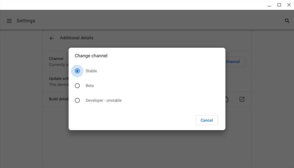 Here, you’ll see a button labeled “Change channel.” Click it, and on that dialog you’ll be able to choose the “Developer” channel. Your Chromebook will then update, after which you’ll need to restart.