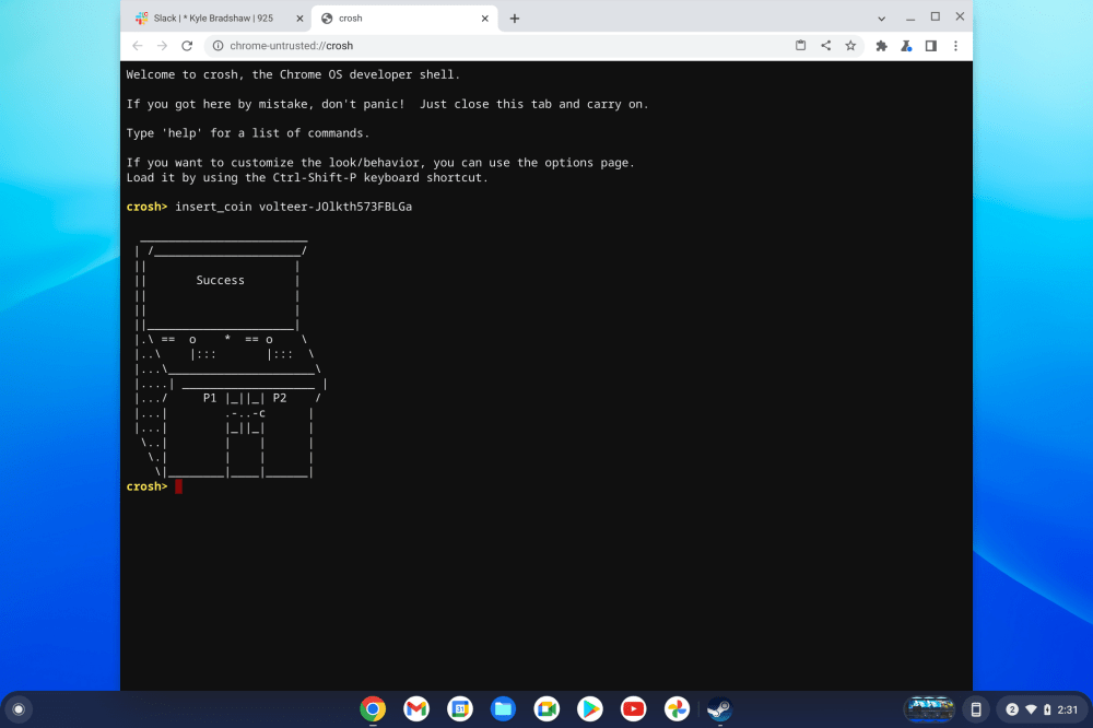 To enter it, you’ll need to access Chrome OS’s hidden terminal by pressing Ctrl-Alt-T. Here, you’ll need to enter a special command that’s cleverly themed after inserting a “token” into an arcade machine.