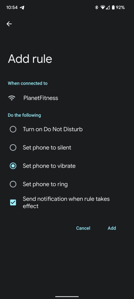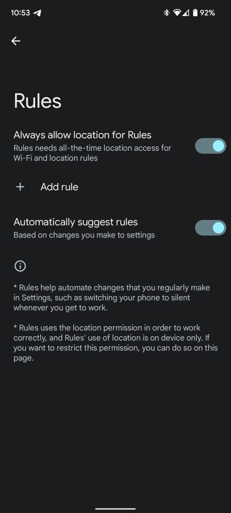 Interestingly, Android will actually suggest Rules for you if it detects that you regularly set your phone to silent/vibrate whenever you arrive at a certain location. You can turn that off, though. More on that below.