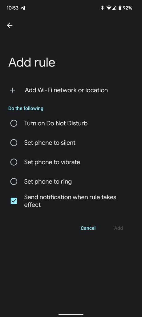 Interestingly, Android will actually suggest Rules for you if it detects that you regularly set your phone to silent/vibrate whenever you arrive at a certain location. You can turn that off, though. More on that below.
