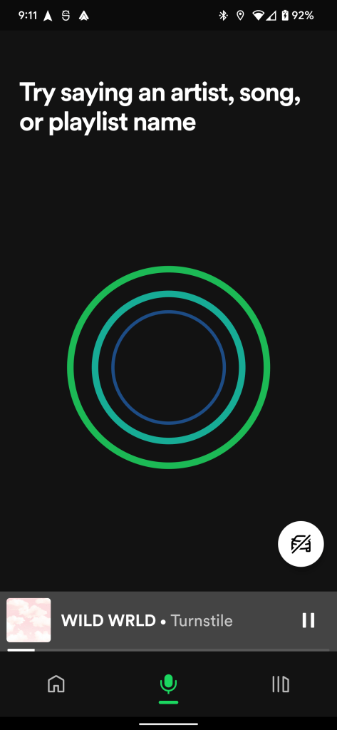 The player view of Spotify’s Car Mode is extremely simple, with only play/pause, skip, shuffle, and like buttons, along with an easy access microphone button for voice controls. The voice controls, also accessible from the middle tab, are your way to search Spotify’s library of music and podcasts while in Car Mode. And the Library tab offers quick access to the music you’ve listened to most recently.
