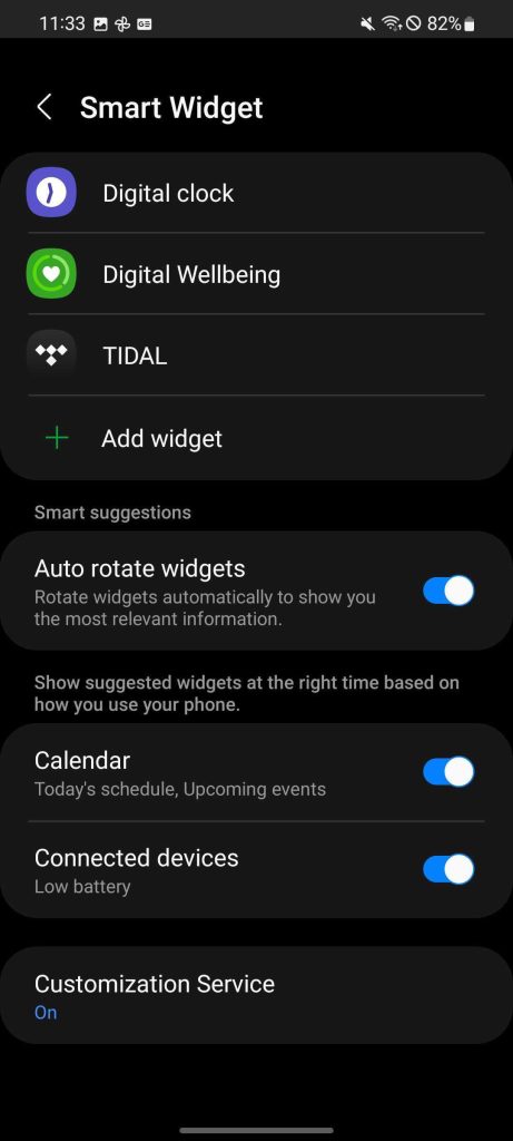 Below the list of apps in the Smart Widget settings page, you can also toggle on/off rotating widgets. This will rotate between widgets based on what your device thinks is the right app to show. Under that, you can choose to include widgets that appear in certain circumstances, such as the calendar on event days or a low battery widget when juice is running low.