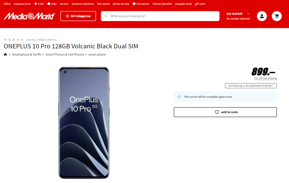 A product listing from MediaMarkt, an online retailer based in Germany, shows the OnePlus 10 Pro in its 128GB variant. The specs and other details are, of course, identical to the Chinese variant, but this is our first indication as to what the price of the global model will be.