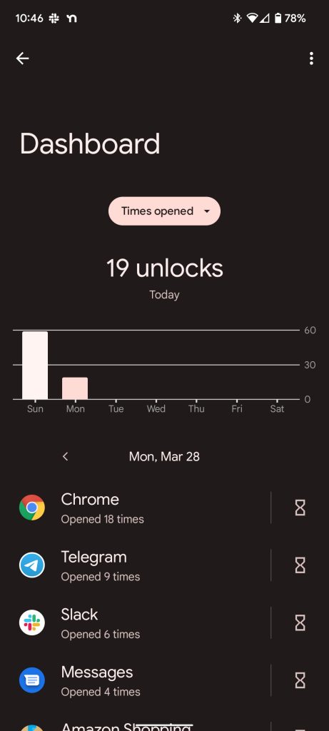 Lastly, Times opened will show you what apps you’ve opened during the day and how many times you opened them. This is similar to screen time in that it gives you an idea of the time you’ve given to an app. At the top of that page, you can also see how many times you’ve opened your phone.