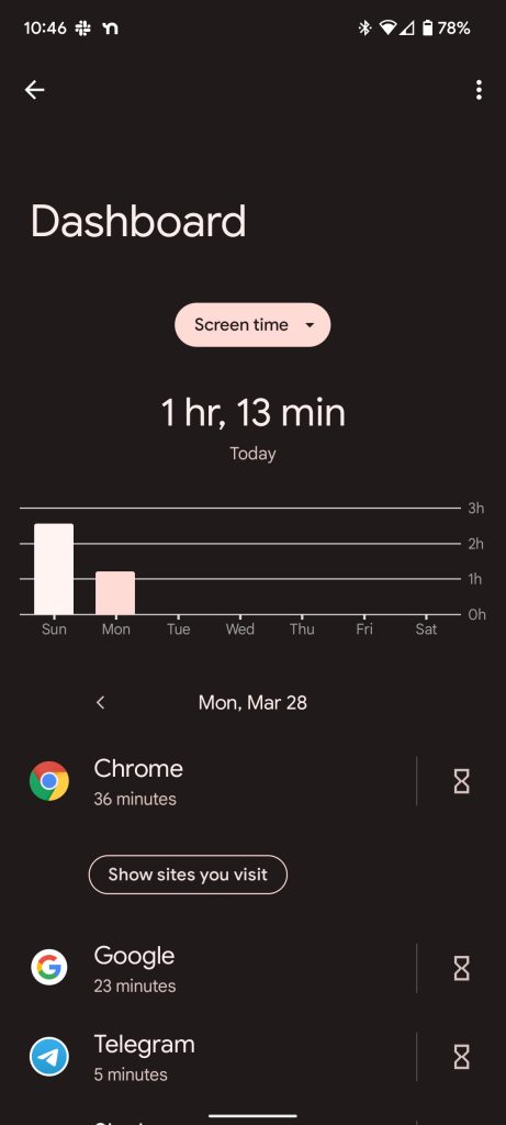 Under Screen time, you can view more than just the top three apps you’ve used in the day. You’ll see all of your activity on this page and how long you’ve spent in each application. If you tap the little hourglass icon on the right of any app, you can set daily limits if you want to really keep an eye on your time spent.