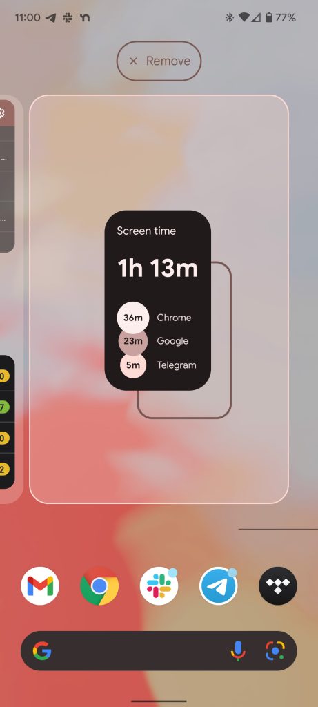 Once you have the Digitial Wellbeing widget on your homescreen, you can adjust it by long-tapping and resizing. Depending on size, different information will be shown. For instance, when the widget is large, the total time you’ve spent on your device, top apps, and minute-count bubbles will visible. At the smallest, only the amount of time you’ve spent on your device will be visible.