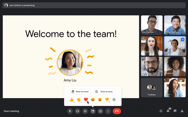 Google Meet reactions are also coming in April. Six emojis will appear in the same menu where you can (on Workspace) “Raise my hand” or “Show as away,” while sent reactions appear over or to the left of video tiles.