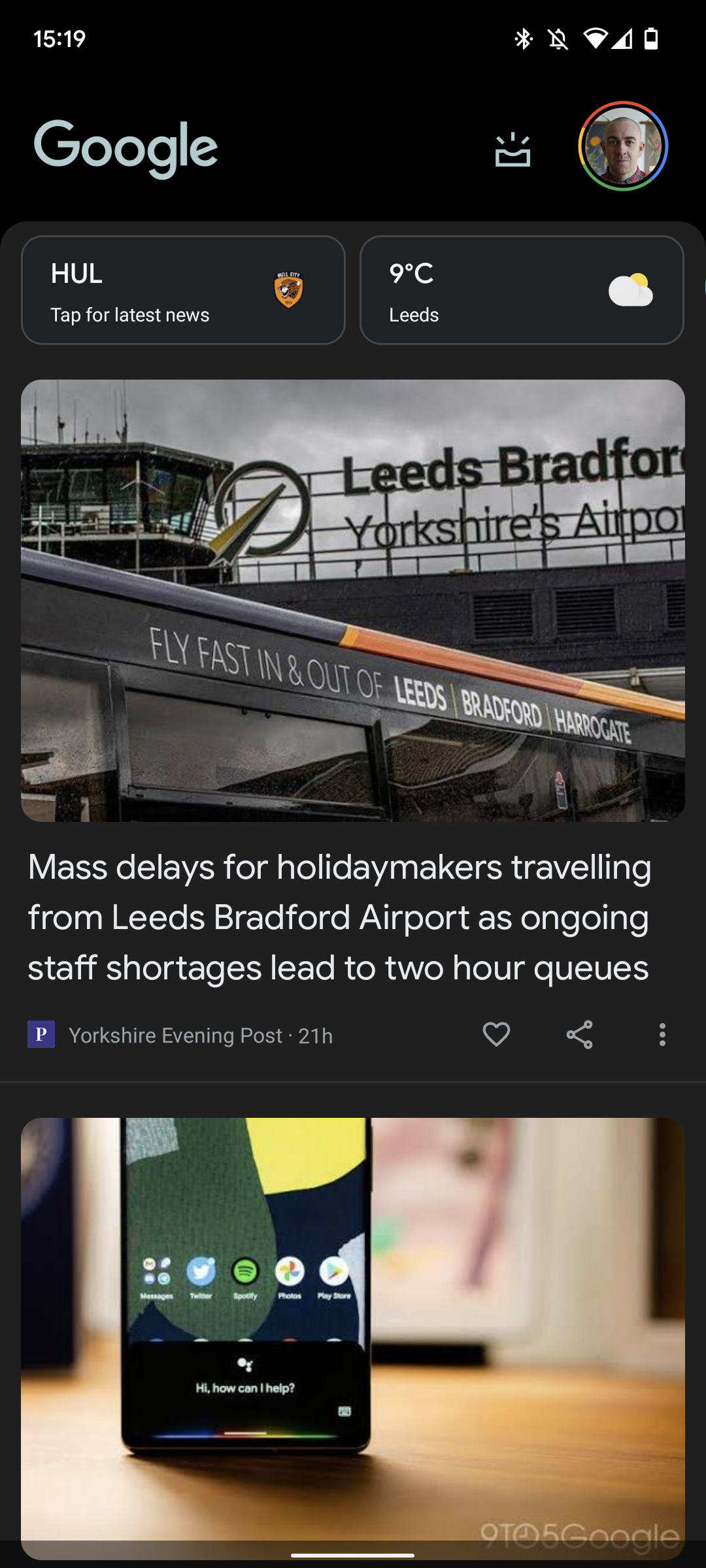 Update 4/5: As this latest Discover redesign continues to roll out, sports fans are finding that the top bar can also include a shortcut to information about one of their favorite teams. As spotted on one of our own devices, instead of showing a single weather bar, the Discover view is now topped by a row of two smaller widgets. One contains a more condensed version of the weather while the other shows a sports team’s abbreviation & logo and “Tap for latest news.”