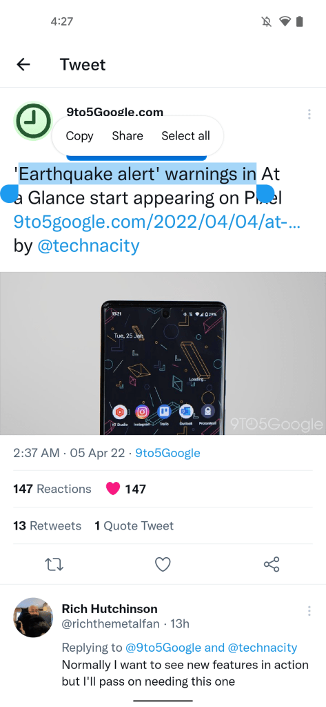 But that’s not all that’s in store for Twitter. As first spotted by Jane Wong, Twitter for Android appears to be working on the ability to select text. Our Dylan Roussel was also able to activate the functionality, as pictured below. This replaces the current behavior, where a long-press on a Tweet copies its contents.