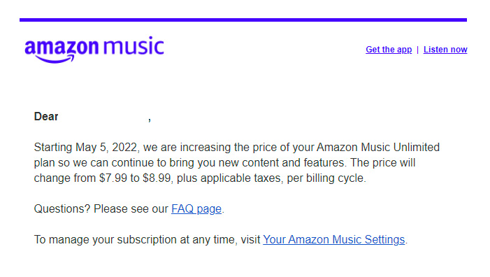Unfortunately, it looks like Amazon Music knows how good of a deal that is and taking baby steps to start racking in much more than what we signed up for. Yesterday, April 5, Amazon Music subscribers got an email letting them know that the monthly Amazon Music Unlimited Individual Plan price would be raised from $7.99 to $8.99, a one-dollar difference. Meanwhile, the Family Plan remains at the same price it was before – $14.99/month.