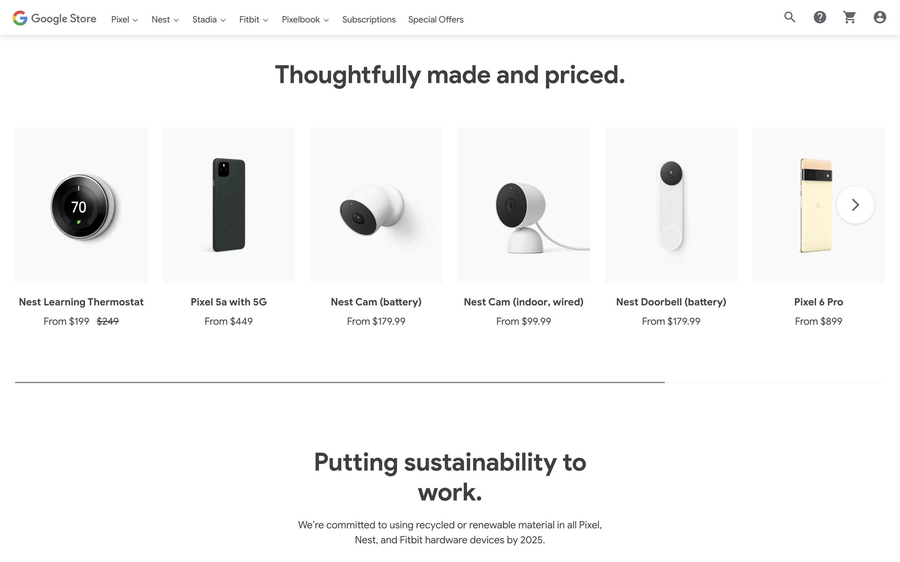 Meanwhile, the product carousel below has been interestingly rejiggered. When the top cover image was advertising the Pixel 6, there was a “New on Google Store” tagline. It then switched to “Made to be helpful” with Pixel Pass, and it’s now “Thoughtfully made and priced.”
