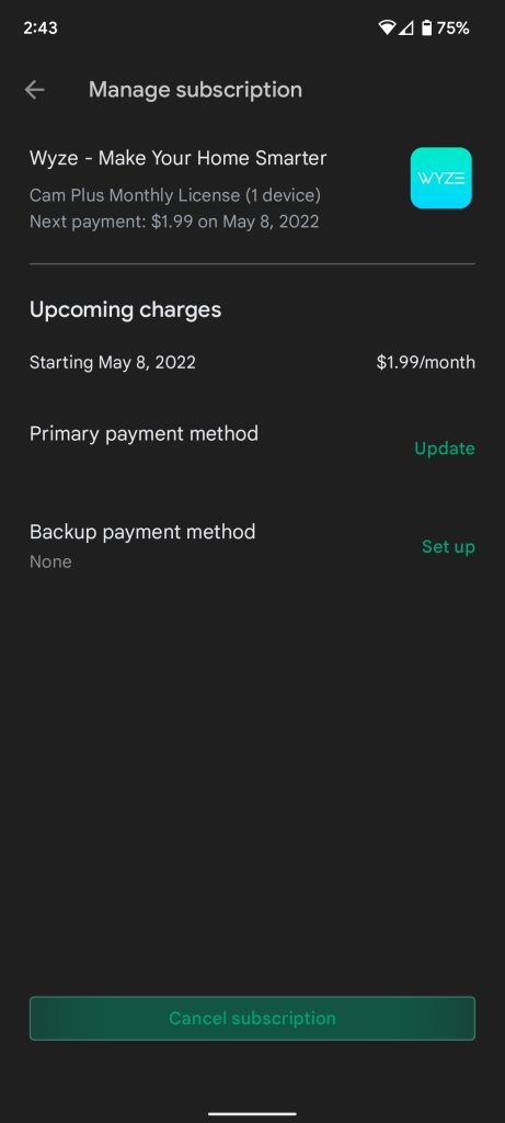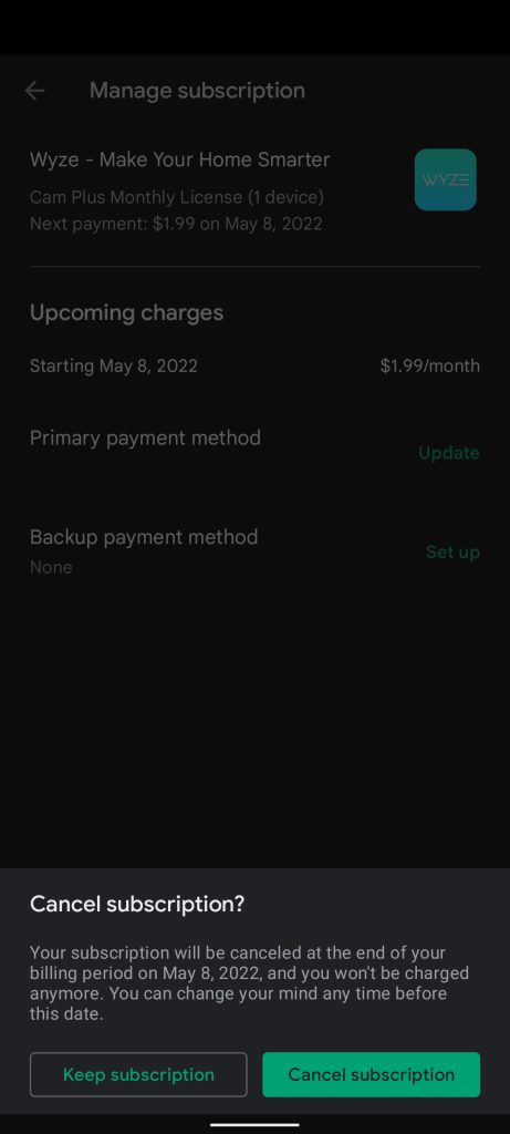 Using Google Play billing makes it a little easier to track your active subscriptions and see where your money is going. When viewing these subscriptions, you get information about the cost per period you’re paying as well as what type of plan you’re on. You can also see which card or account you’re paying with and can create a backup method.