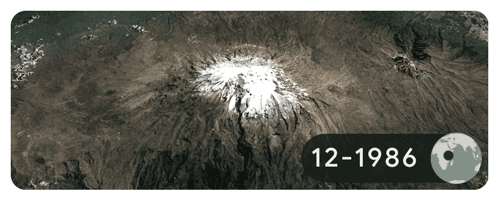 The first climate change animation to be shown on the homepage features Mt. Kilimanjaro in Tanzania, Africa. Over the course of December 1986 to December 2020, you can see the mountain’s glacier steadily and significantly shrink. Later in the morning, things will change over to an even more stark instance of glacier retreat occurring in Sermersooq, Greenland, between 2000 and 2020.