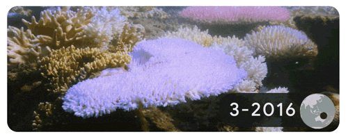 In the afternoon, things will switch to an animation of coral bleaching occurring near Lizard Island in the Great Barrier Reef across a year and a half. Coral goes through the process of expelling its algae — and therefore its color — in response to changes to the climate of the water, including the temperature, light level, and amount of nutrients.
