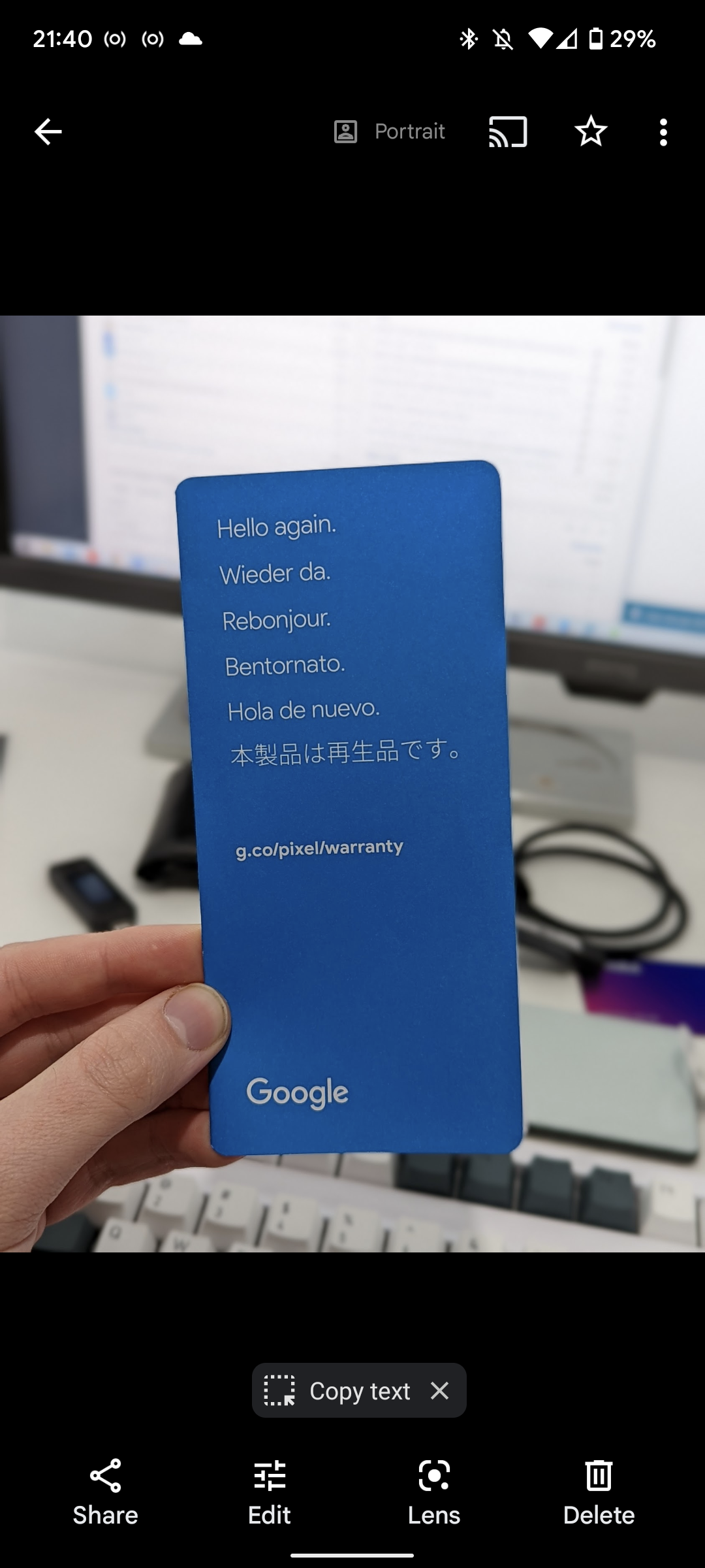 Rather than needing to dive into the further “Edit” section or swiping up to directly access, if you open an image with a large volume of text, you’ll get a floating toolbar with Google Lens, “Copy text,” “Listen,” “Crop,” and “Markup” chips that mean you don’t need to enter another deeper menu within the Photos app on Android. We’re seeing this most prominently with screenshots, but even images with some text will offer up a “Copy text” chip too:
