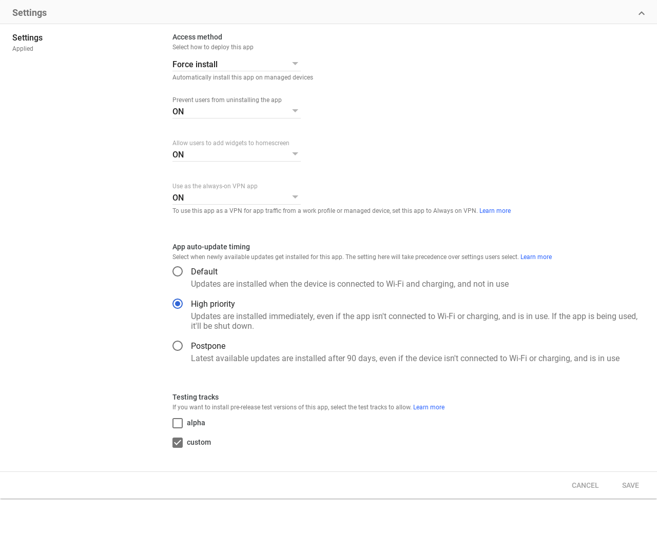 Previously, the default behavior for app updates in managed Google Play was contingent on the device being connected to a Wi-Fi network, to be charging, and not being actively used. This behavior is not always suited to the needs of our customers and admins need more granular control over how apps are updated.