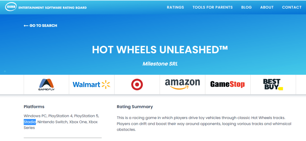The biggest find this week, though, came via our friends over at StadiaSource. Hot Wheels Unleashed, the well-received racing game, was spotted on the ERSB as rated for Google Stadia. While this is no direct confirmation, it’s certainly strong evidence, and also comes after a mention of Stadia was spotted last year on the Hot Wheels Unleashed official website.