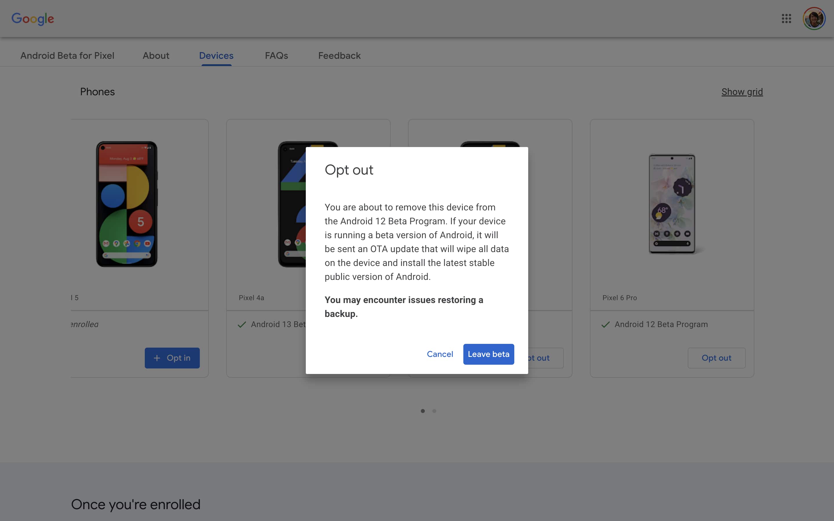 That said, Google has identified an edge case where you might have to go back to stable before seeing the Android 13 option on the website: