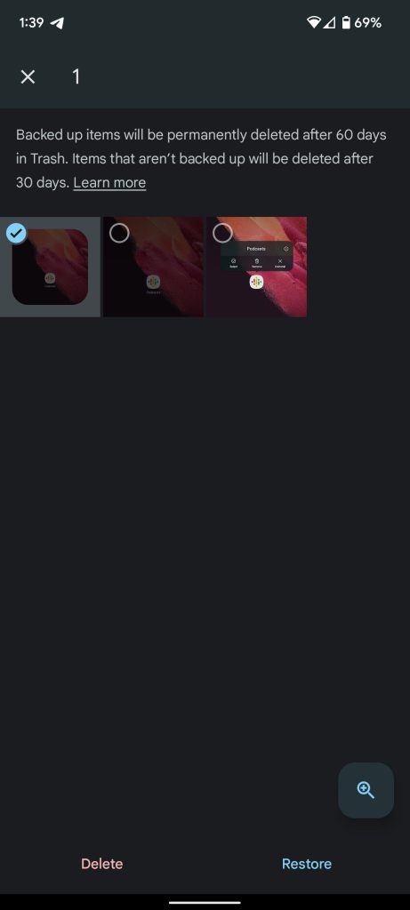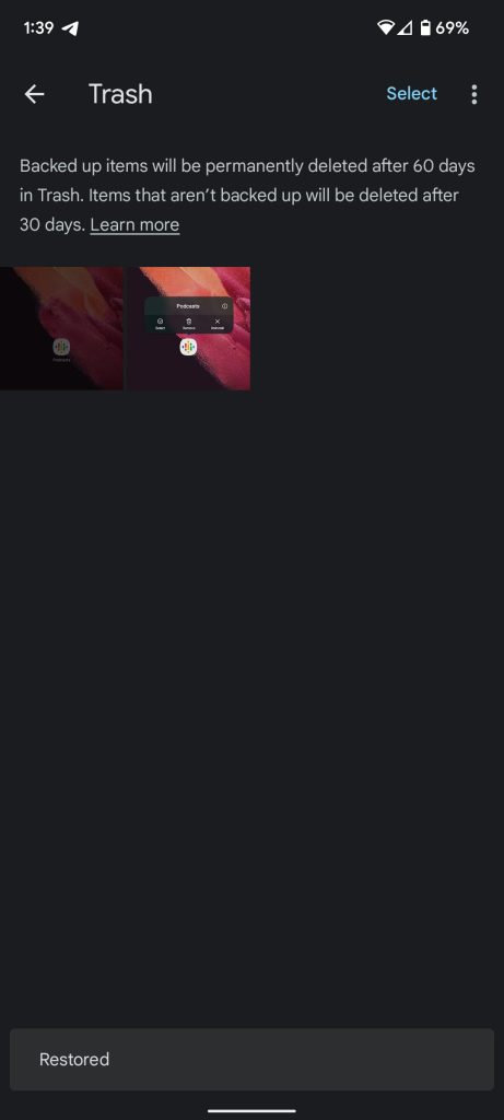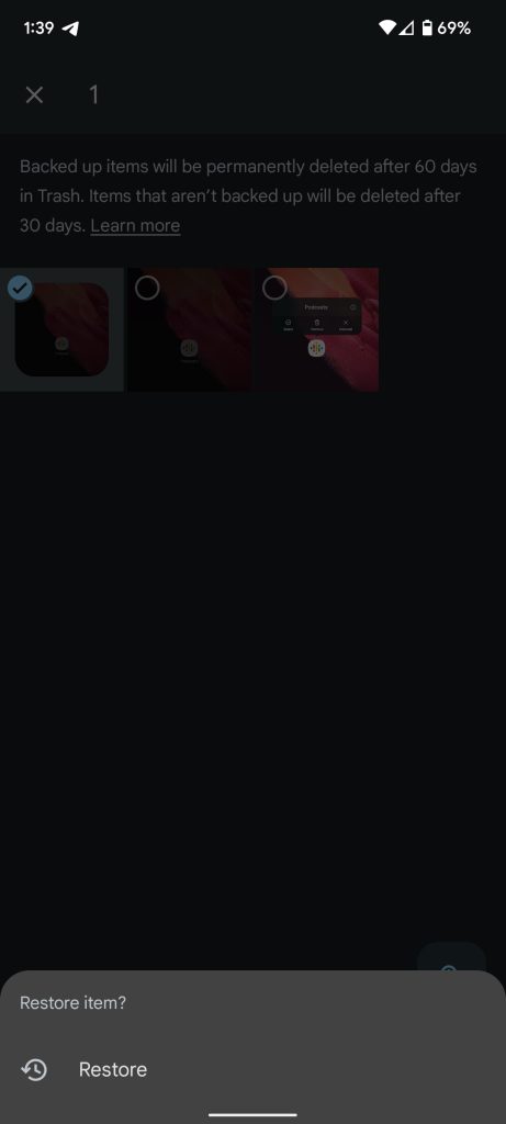 - Once in the Trash section, long-tap or click the checkmark on any photo. This will enter selection mode. Click or tap any extra photos you want to restore.