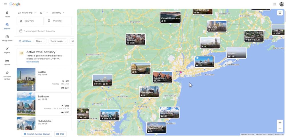 Lastly, the Explore tool on Google’s Travel site will let “Explore nearby”: