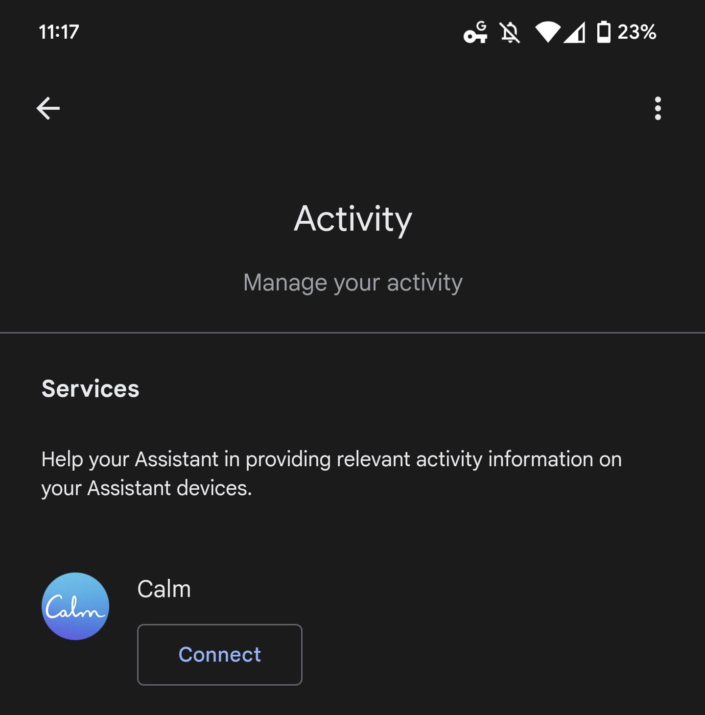 Primarily, Assistant settings > Wellness > Activity today just lists the Calm service. Google Fit and Fitbit will soon appear here for you to “Connect” to Google Assistant.