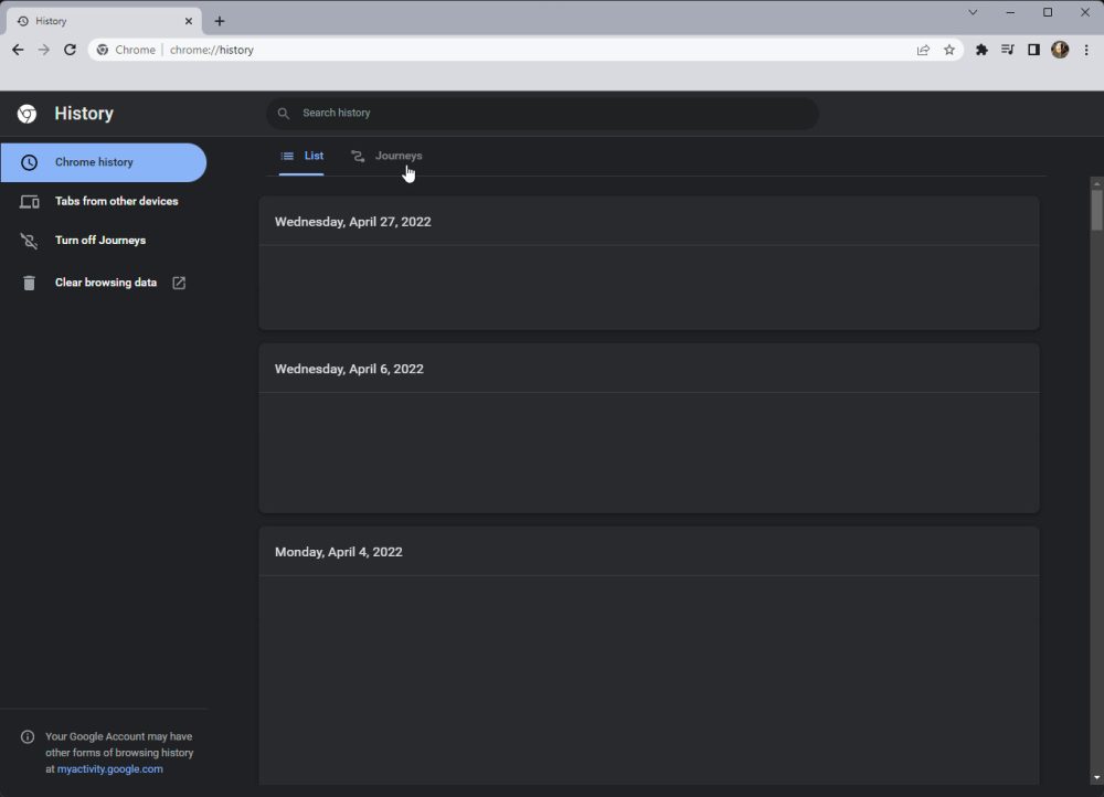 - You’ll see Chrome’s History page initially, but your want to click Journeys at the top.