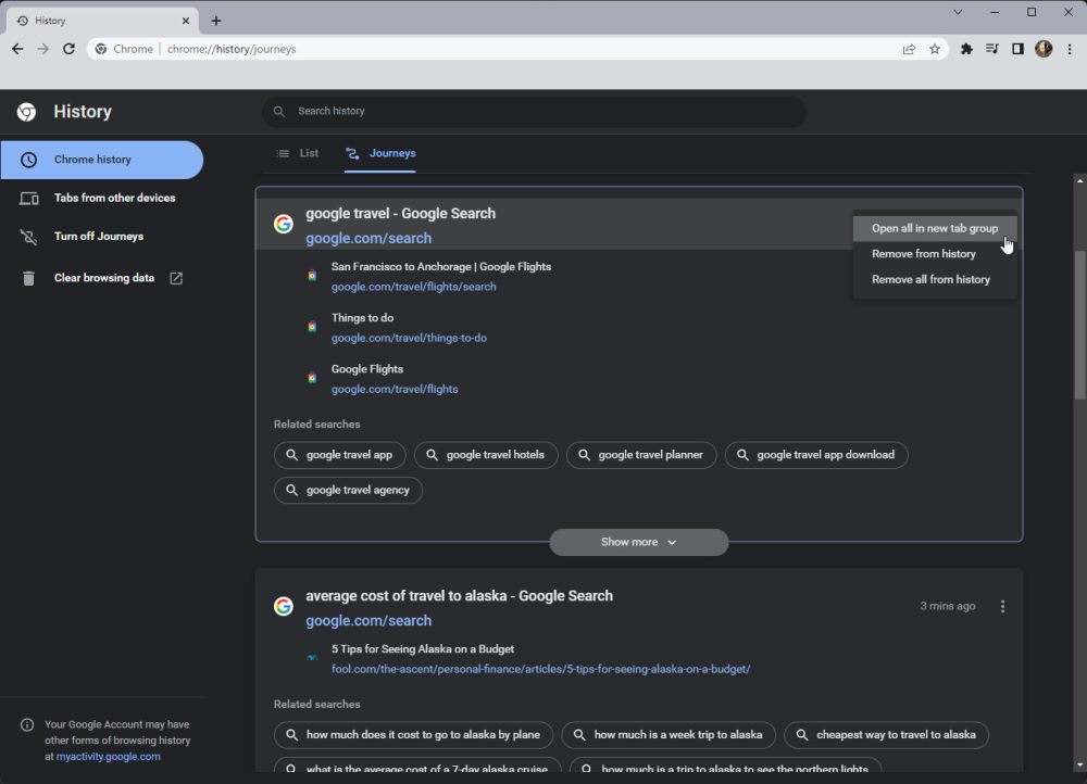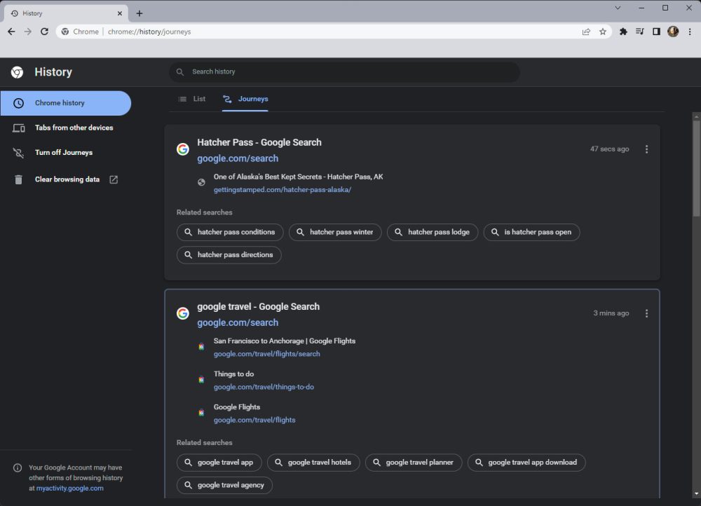 Journeys allow users to see their path through the internet in grouped-up entries. Those entries are based on the topic you searched for or found and display all the sites that you visited in that search. For instance, if you did end up researching a trip to Alaska, Google Chrome’s Journeys page would show you all of the sites you visited that had to do with that research. That includes the initial Google Search, pages you visited from there, and so on. All the information is displayed in a neat window and helps you revisit any of those pages with ease. This is Chrome’s answer to interrupted searches and the natural derailments you experience when browsing the internet.