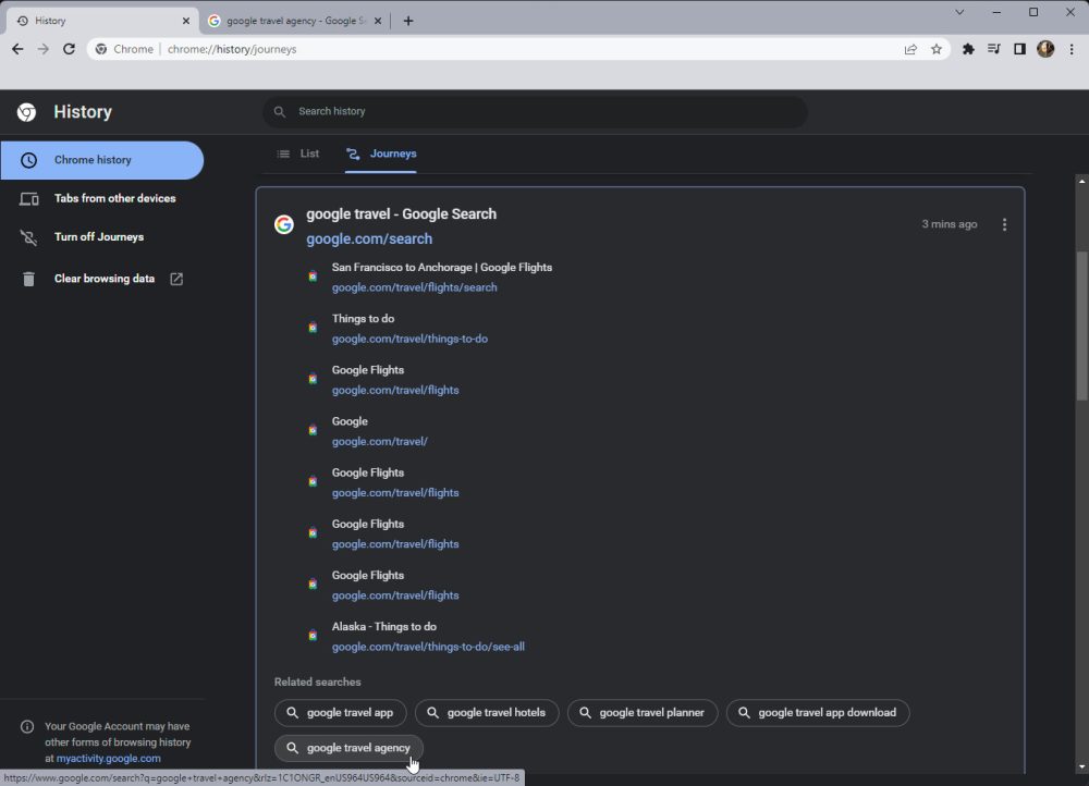 Journeys allow users to see their path through the internet in grouped-up entries. Those entries are based on the topic you searched for or found and display all the sites that you visited in that search. For instance, if you did end up researching a trip to Alaska, Google Chrome’s Journeys page would show you all of the sites you visited that had to do with that research. That includes the initial Google Search, pages you visited from there, and so on. All the information is displayed in a neat window and helps you revisit any of those pages with ease. This is Chrome’s answer to interrupted searches and the natural derailments you experience when browsing the internet.