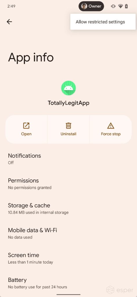 Importantly, this won’t affect all sideloaded apps. Google confirmed that this change only applies to APK files, not apps installed from third-party apps stores, with F-Droid as one example. The goal, apparently, is to restrict access for apps that come from “less legitimate” sources. There’s also a hidden setting in the app details page, as seen above, that allows the phone’s owner to authenticate their identity and allow access to these newly restricted settings.