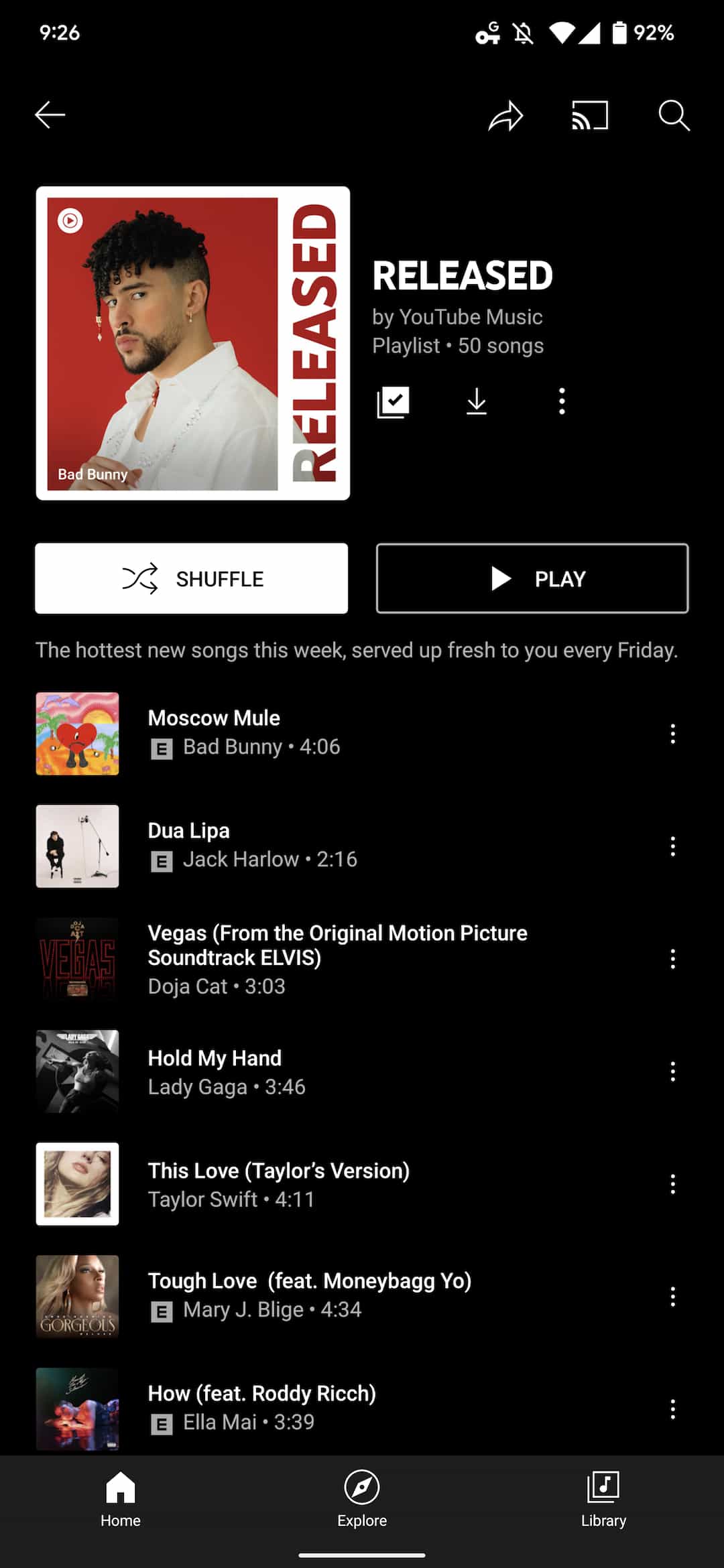 You then get the name of the playlist in a larger font size and the description. All buttons (placed within circles) appear on a single line: download, add to library, play, share, and the overflow menu. Share previously used to be in the top-right corner next to Cast and search (which are unchanged today). Lastly, this top area uses a blurred background of the cover art.