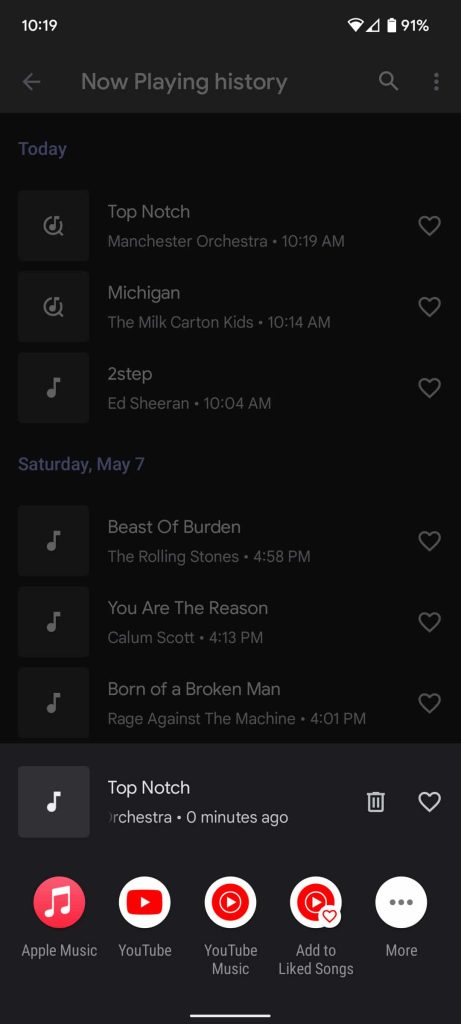 From there, you can run through and look over the songs that have played over time near you. You can tap any one of these and do a couple of things. You can open the song with your preferred streaming service, YouTube, or YouTube Music. You can also go through and like songs you want to have saved.