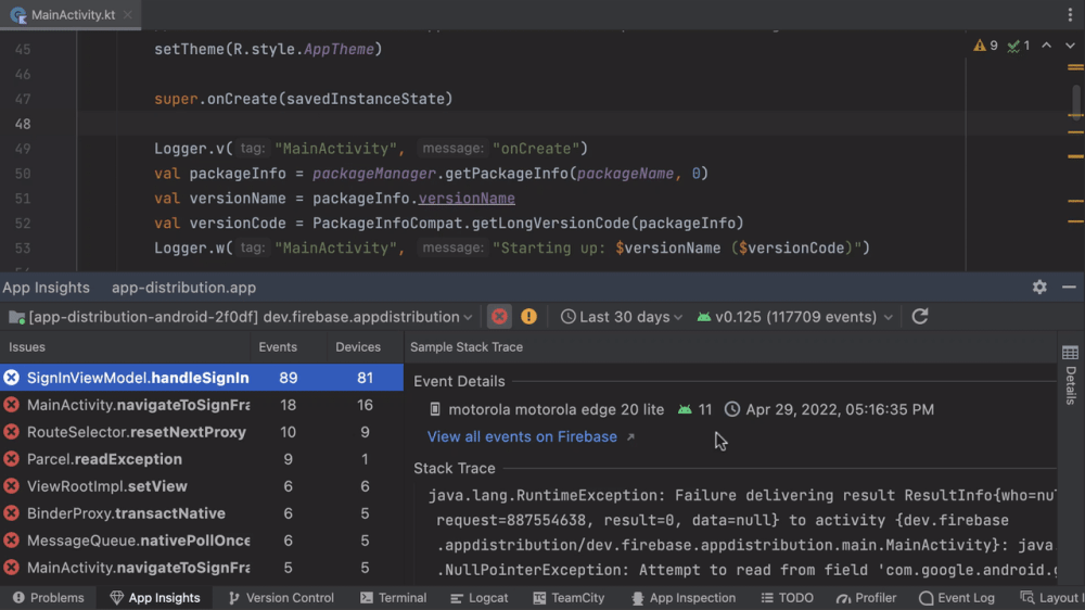 With the upcoming release of Android Studio Electric Eel, currently in Canary, your data from Crashlytics is now available in a new “App Quality Insights” window. This makes it even easier to dive into each crash and the parts of your code likely to be responsible. For now, Android Studio’s Crashlytics integration only works with Android applications written in Kotlin or Java, but Firebase Product Lead Francis Ma confirmed to us that additional support for Flutter applications is coming soon.